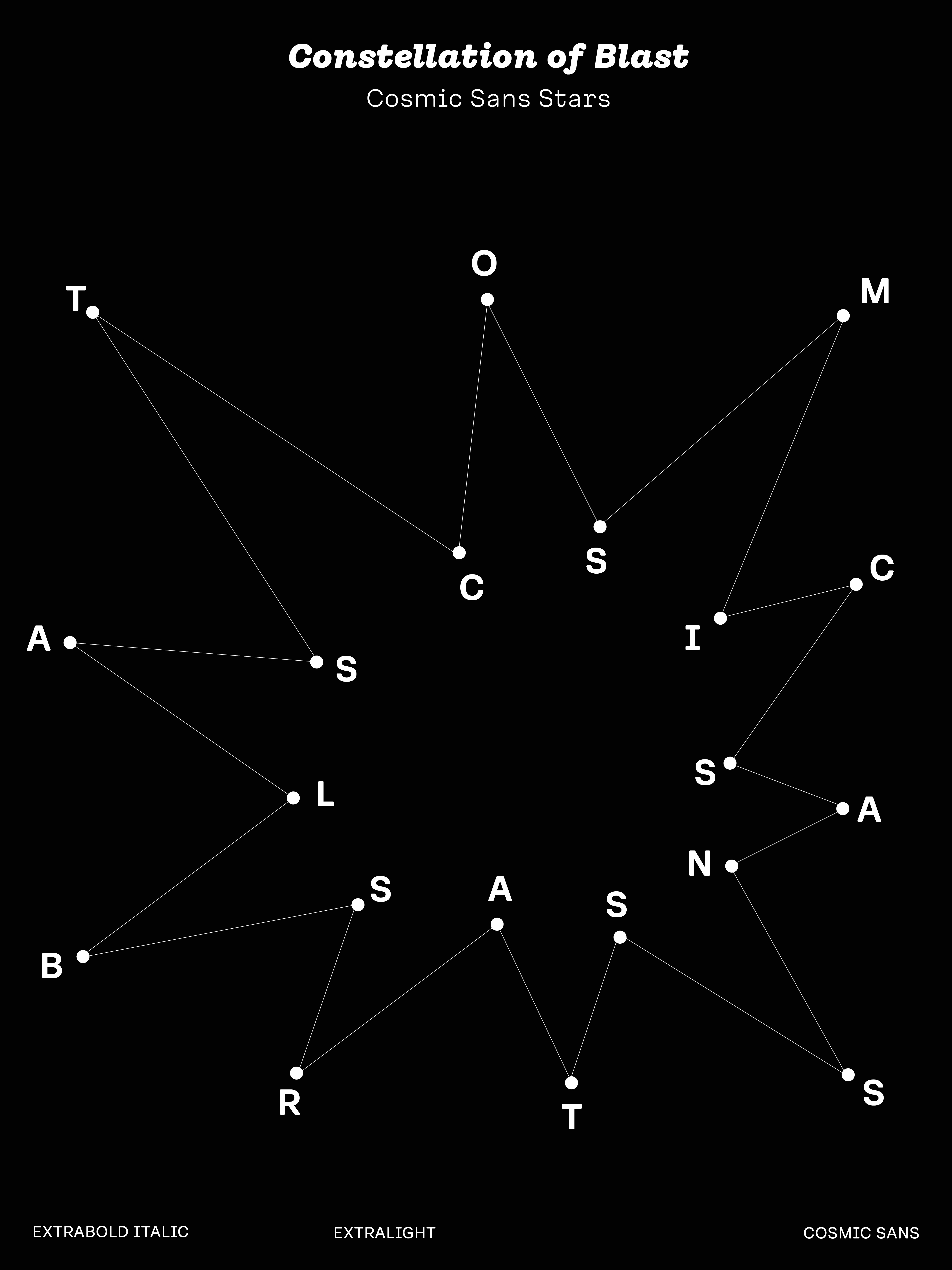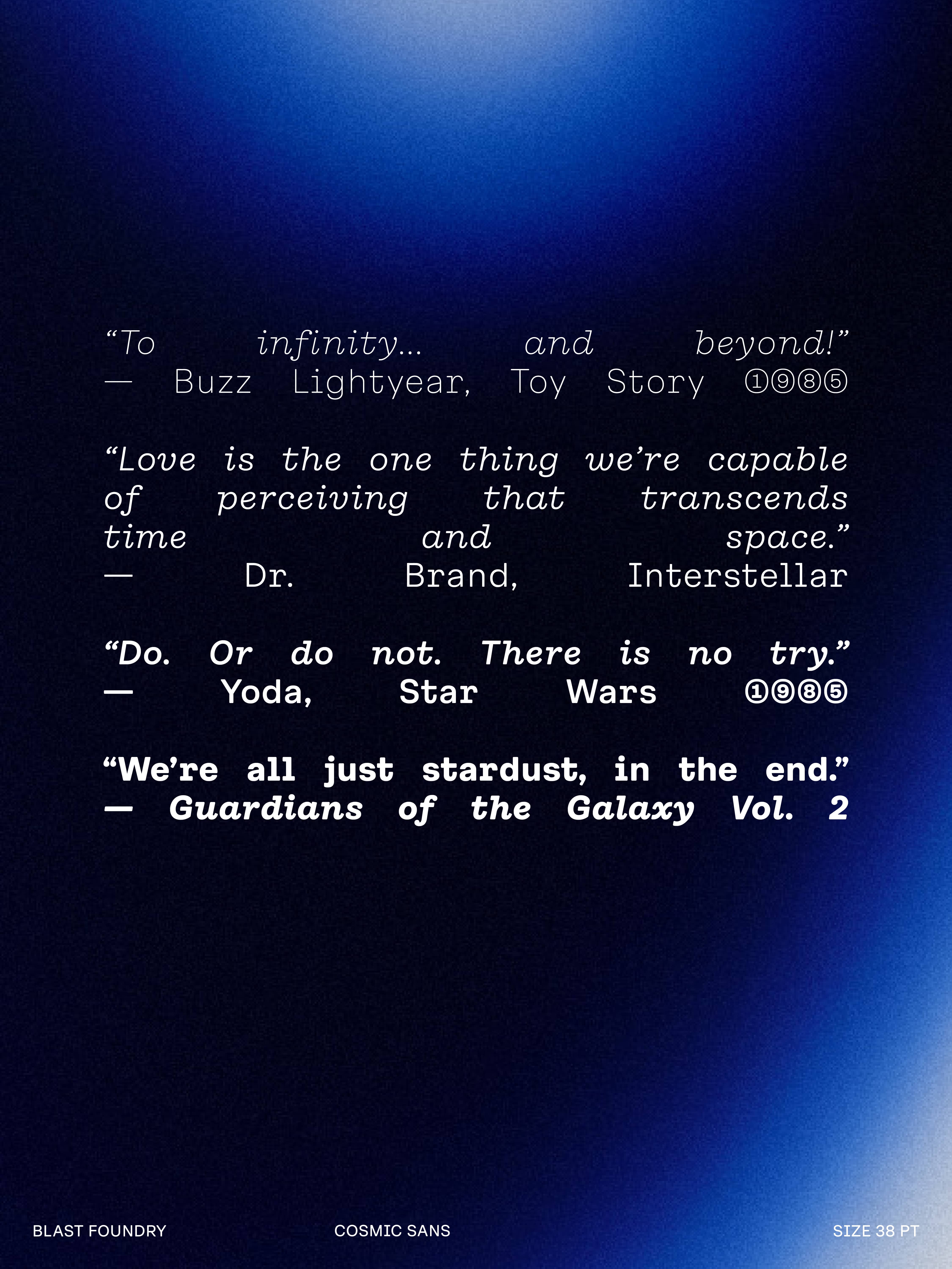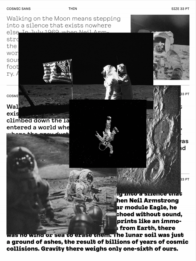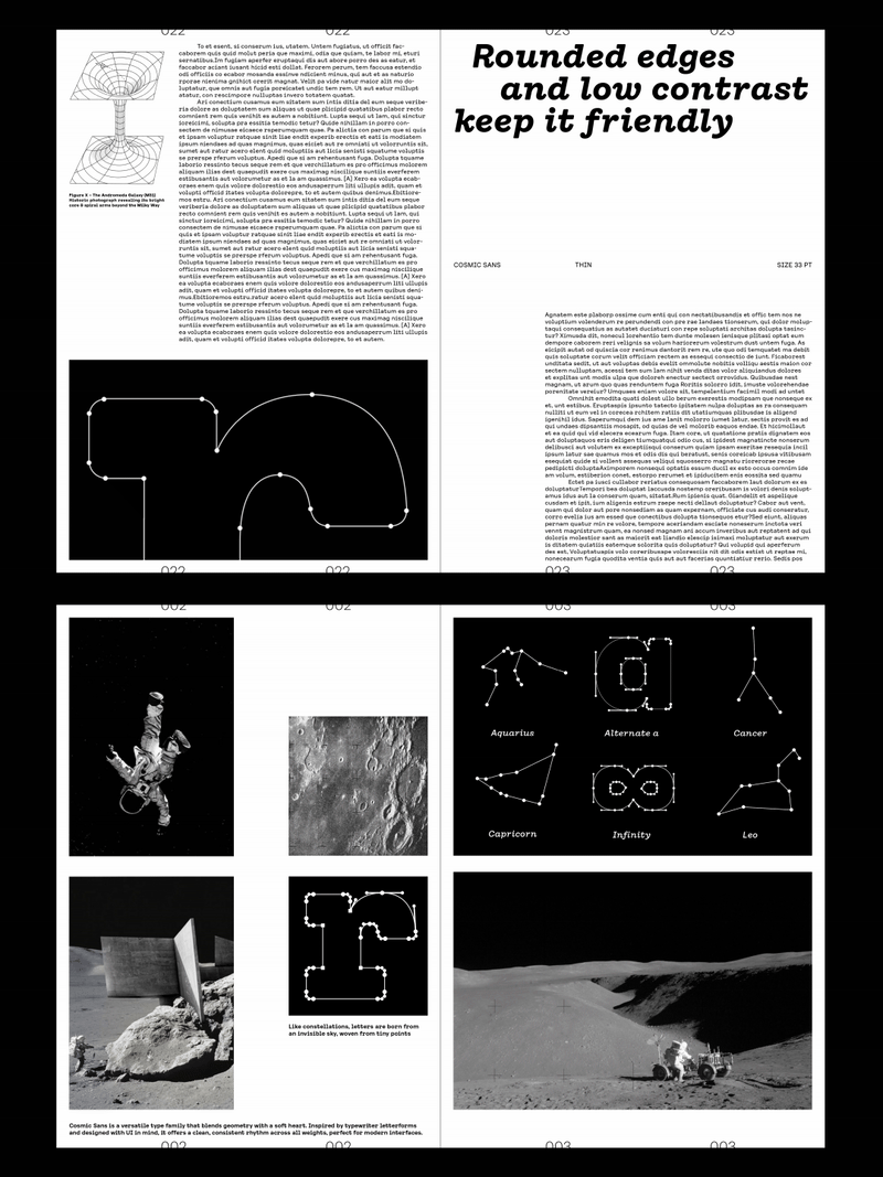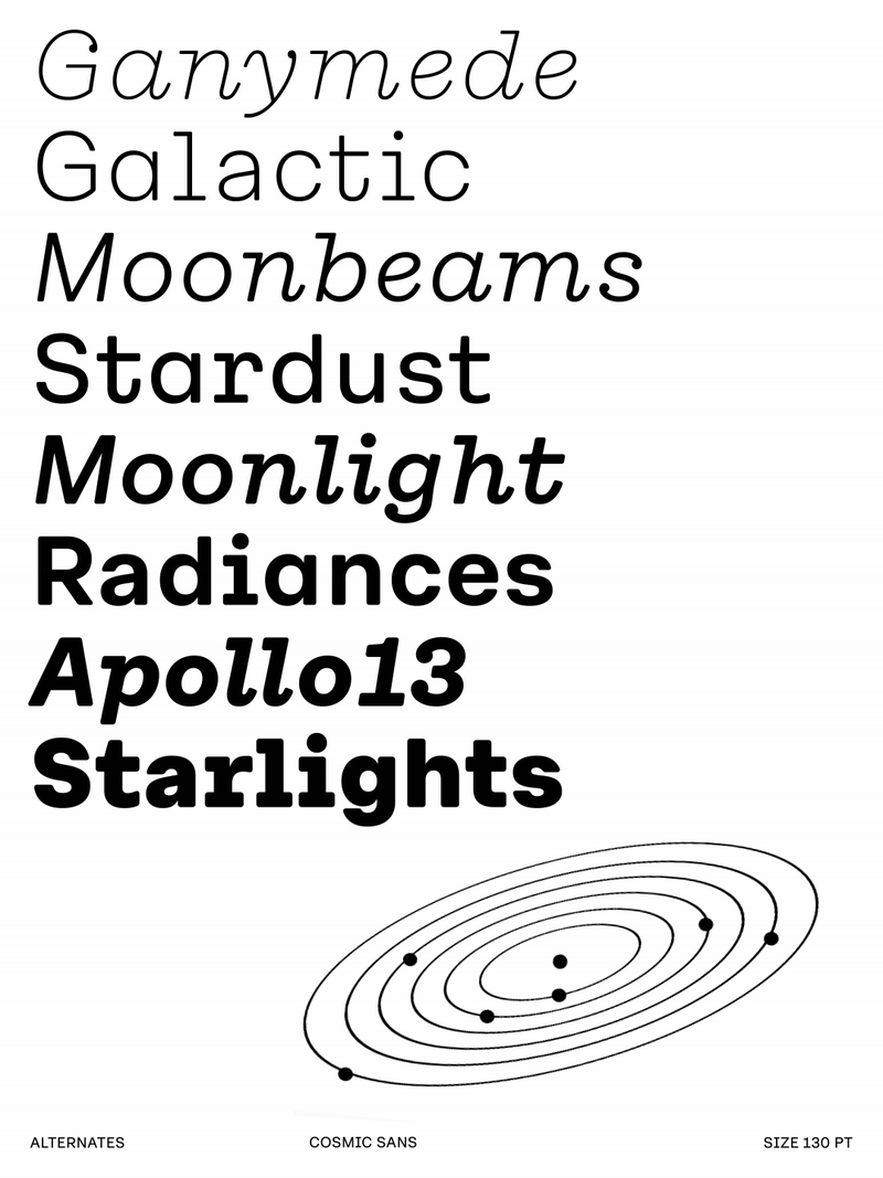 We didn’t design Cosmic Sans with space in mind. It started as a typeface for the cosmetics world. At some point during the process, we began calling it “Cosmetic Sans,” and from there, the name was jokingly shortened to “Cosmic Sans.” It was part pun and part placeholder, but it stuck. Not because the typeface looks like a galaxy, but because it feels like a calm signal drifting through one. It is balanced, curious, and just a little otherworldly.