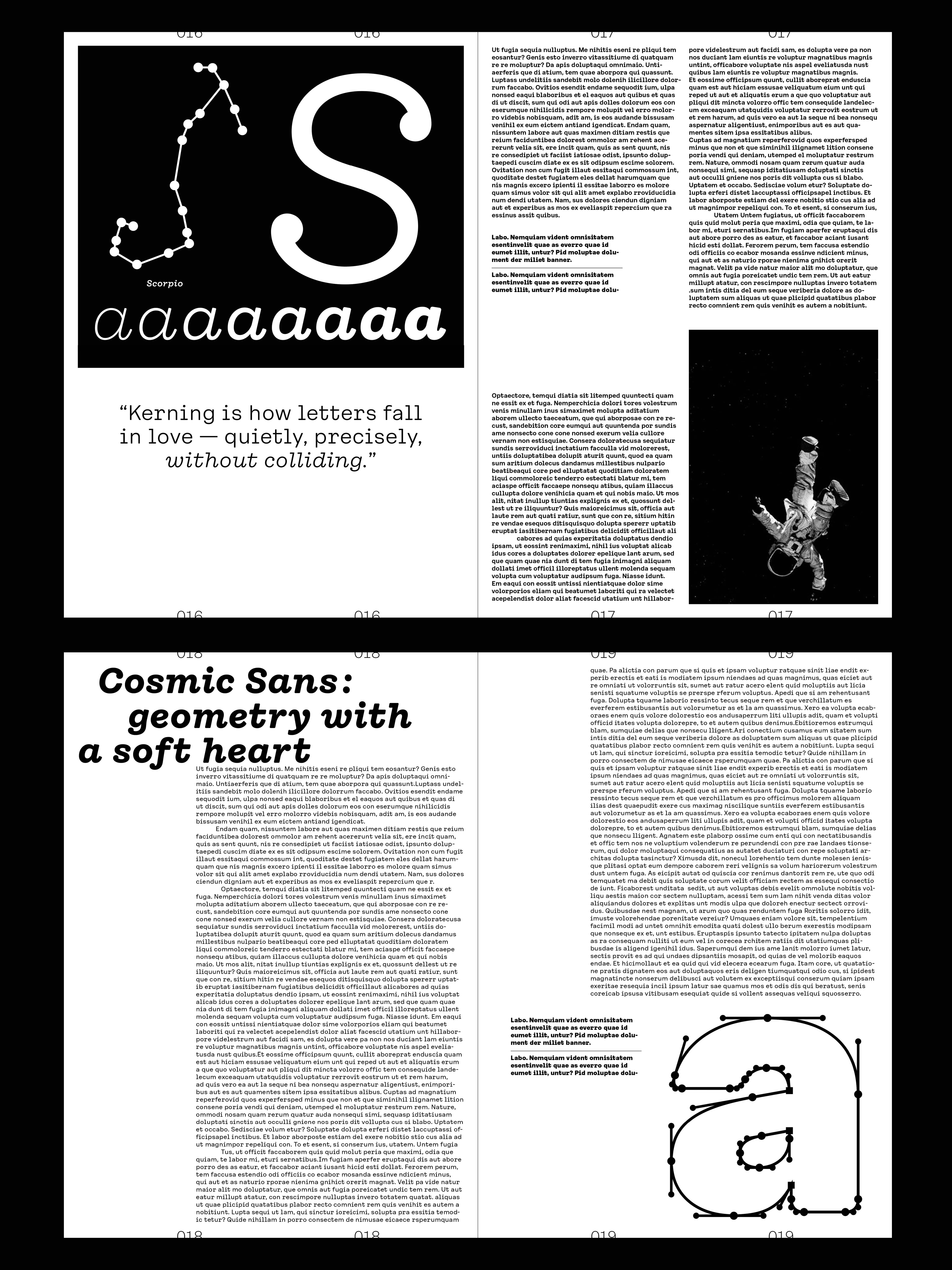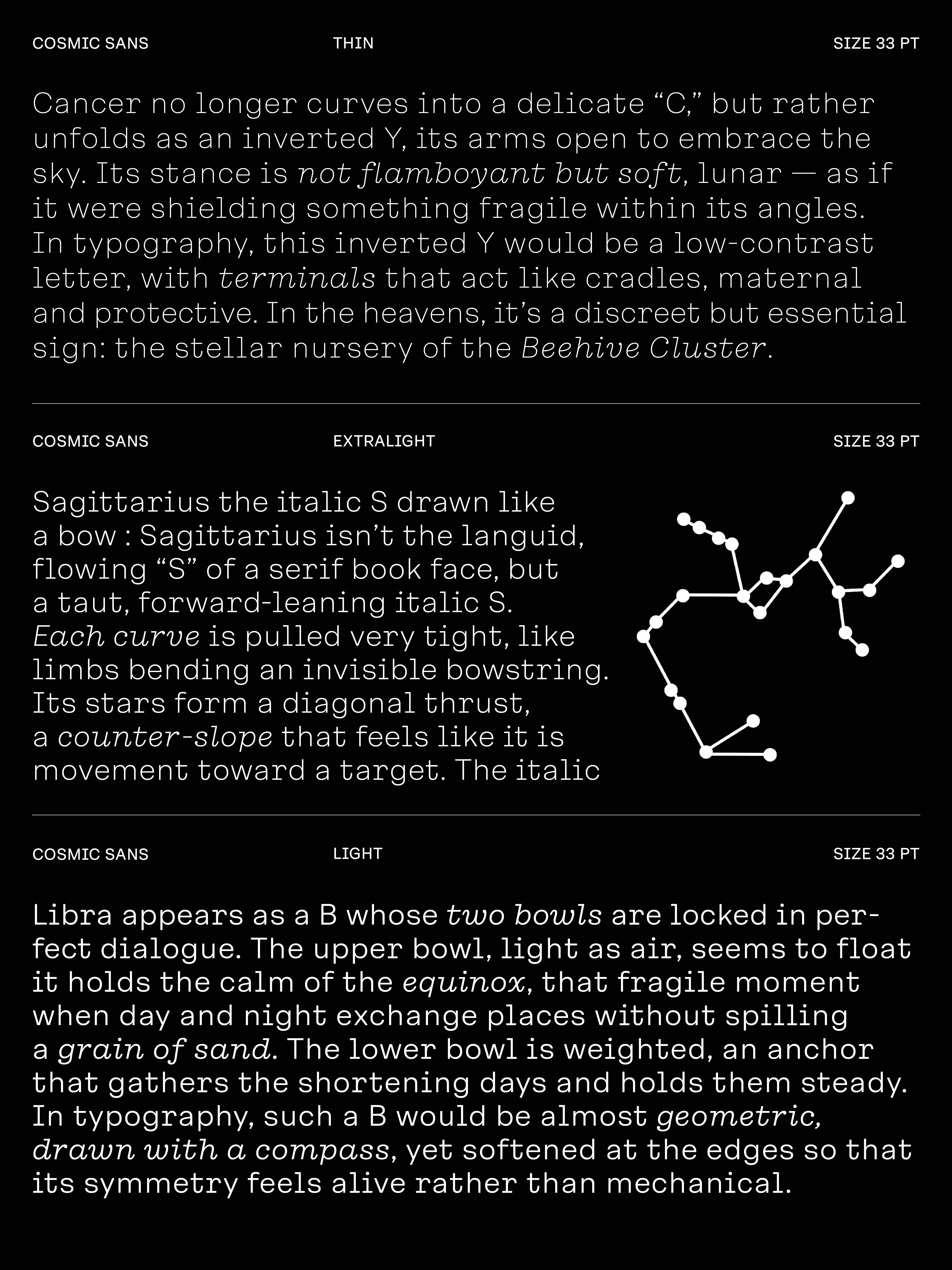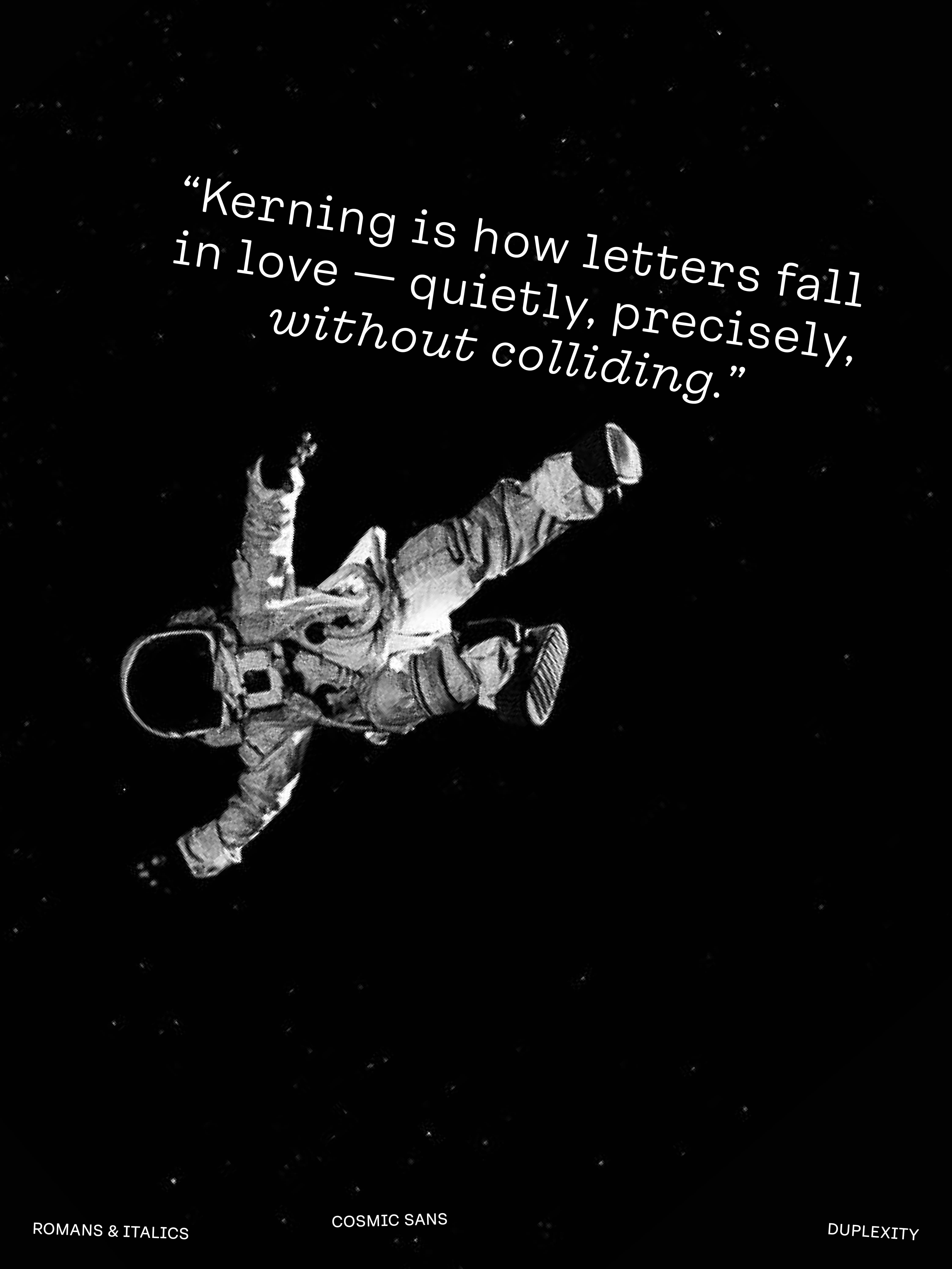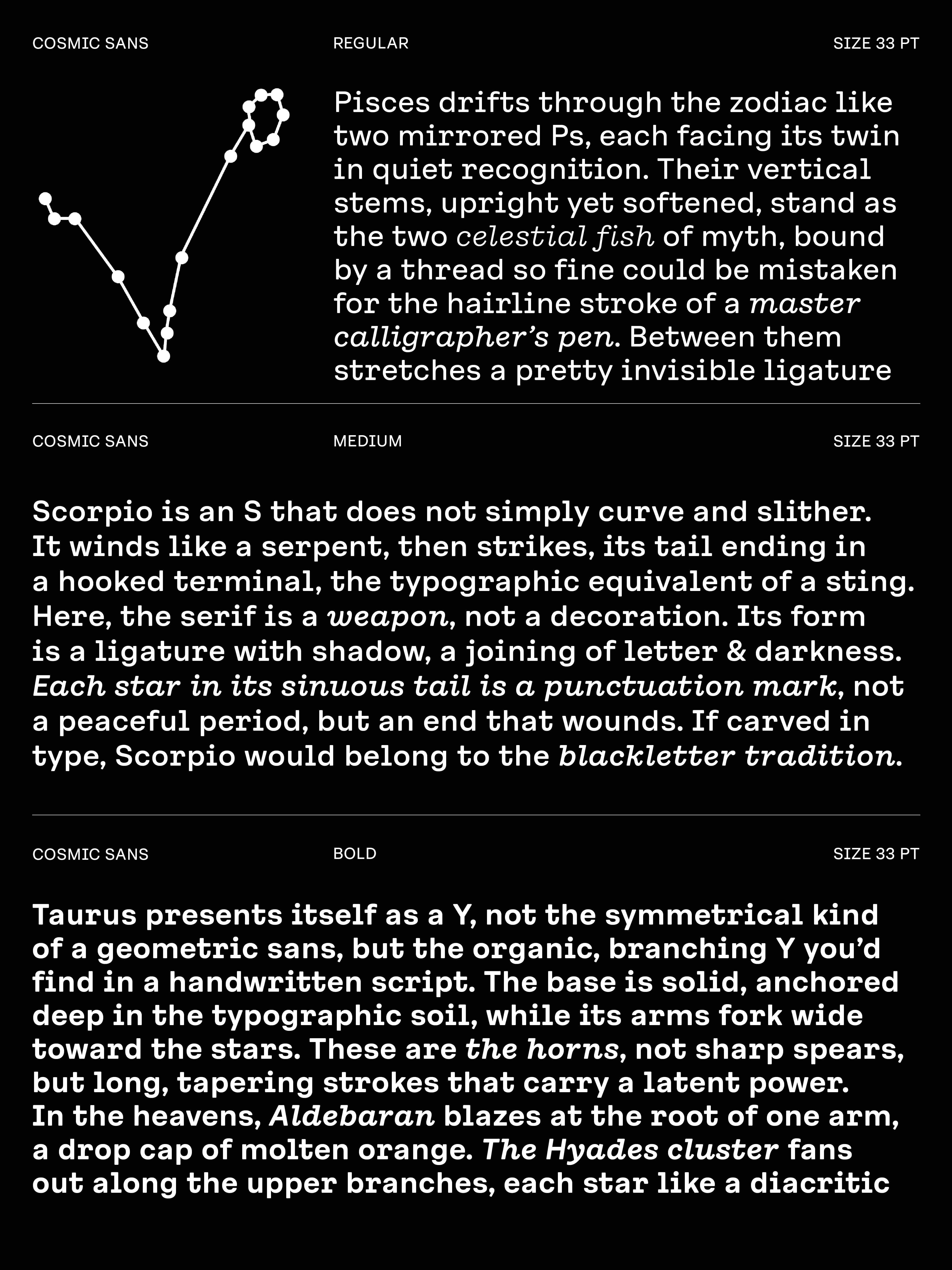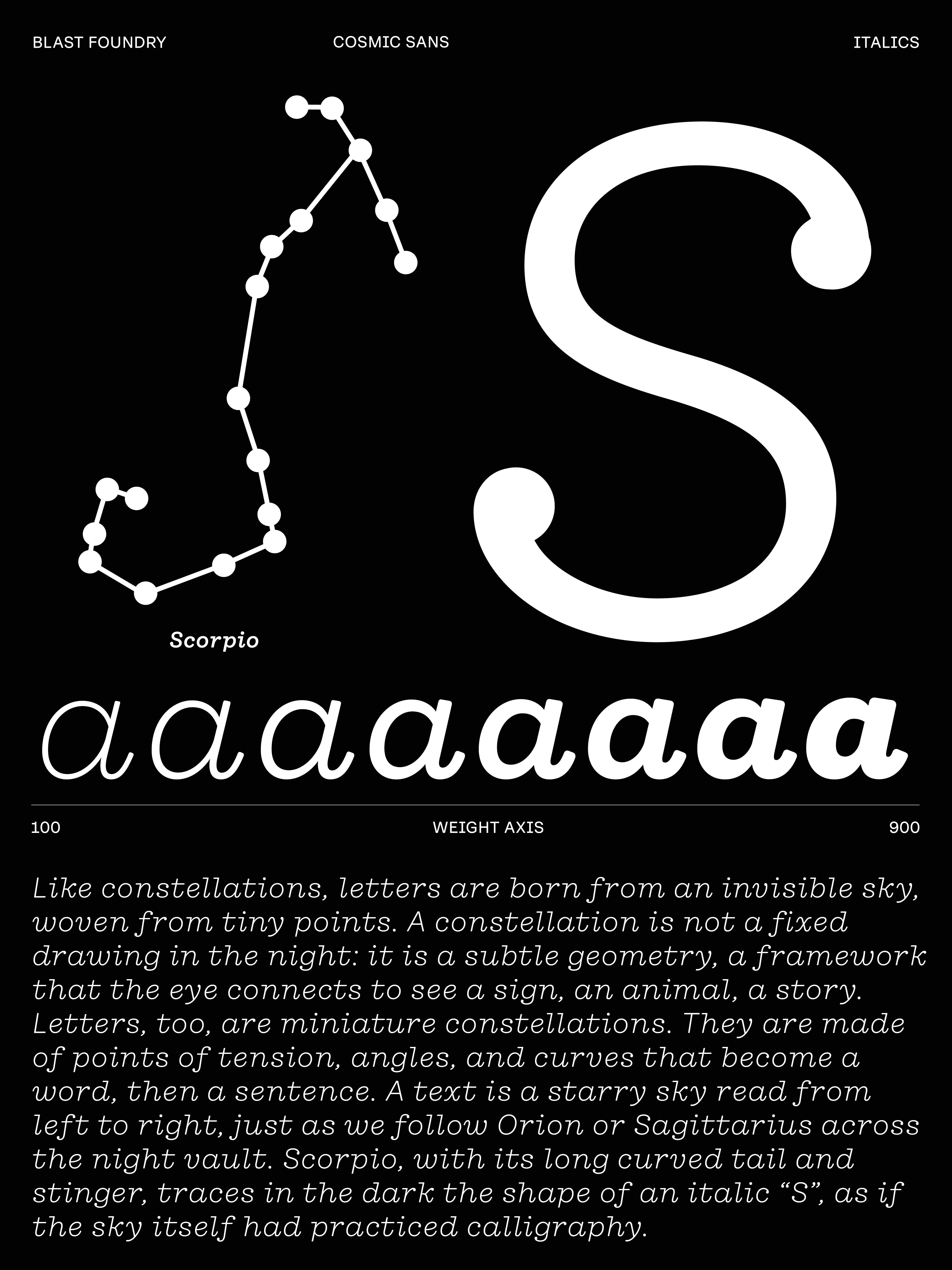 We didn’t design Cosmic Sans with space in mind. It started as a typeface for the cosmetics world. At some point during the process, we began calling it “Cosmetic Sans,” and from there, the name was jokingly shortened to “Cosmic Sans.” It was part pun and part placeholder, but it stuck. Not because the typeface looks like a galaxy, but because it feels like a calm signal drifting through one. It is balanced, curious, and just a little otherworldly.