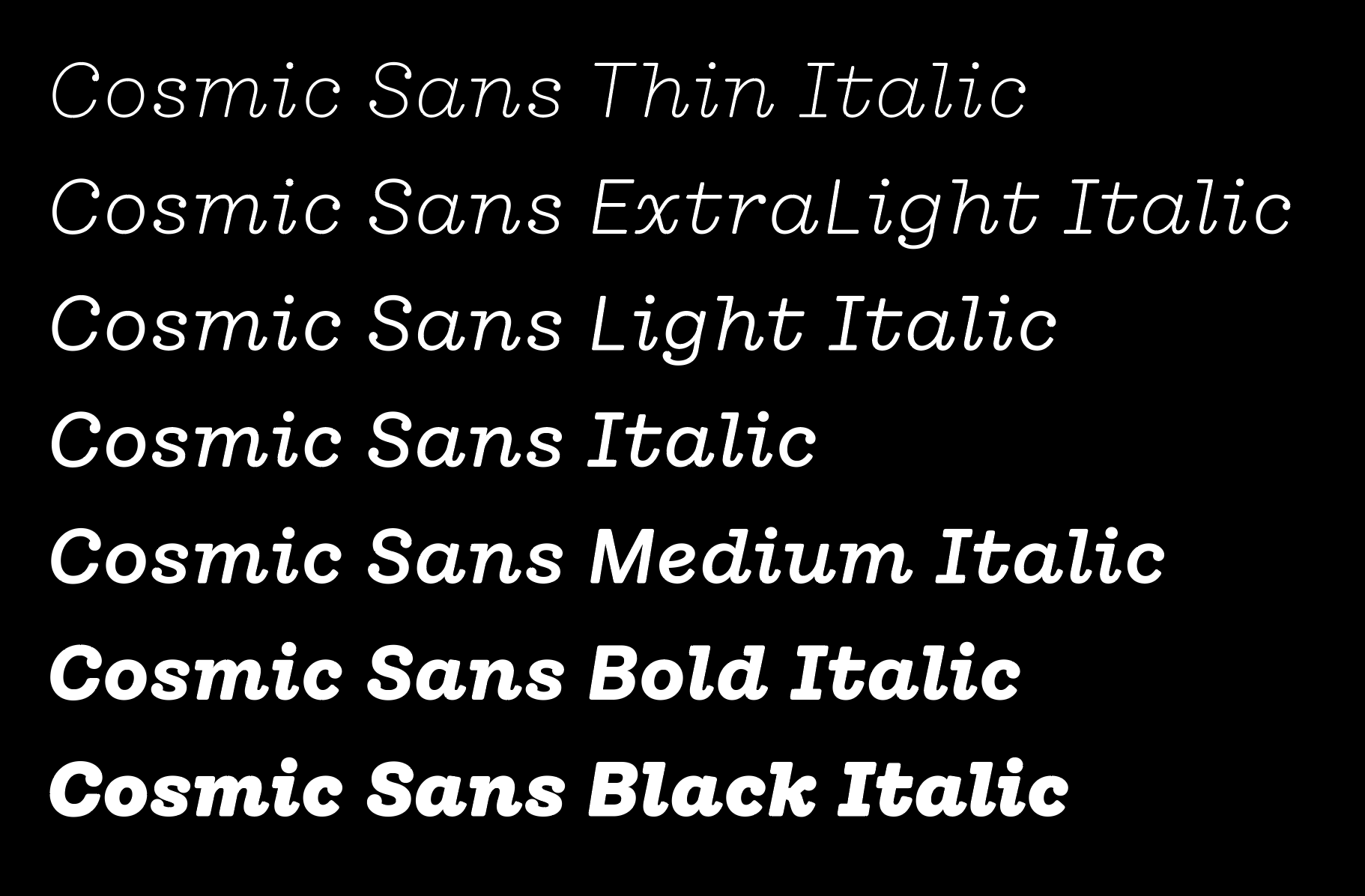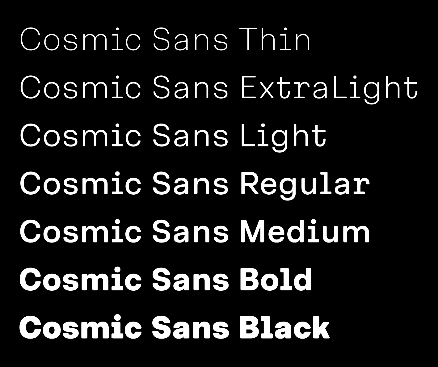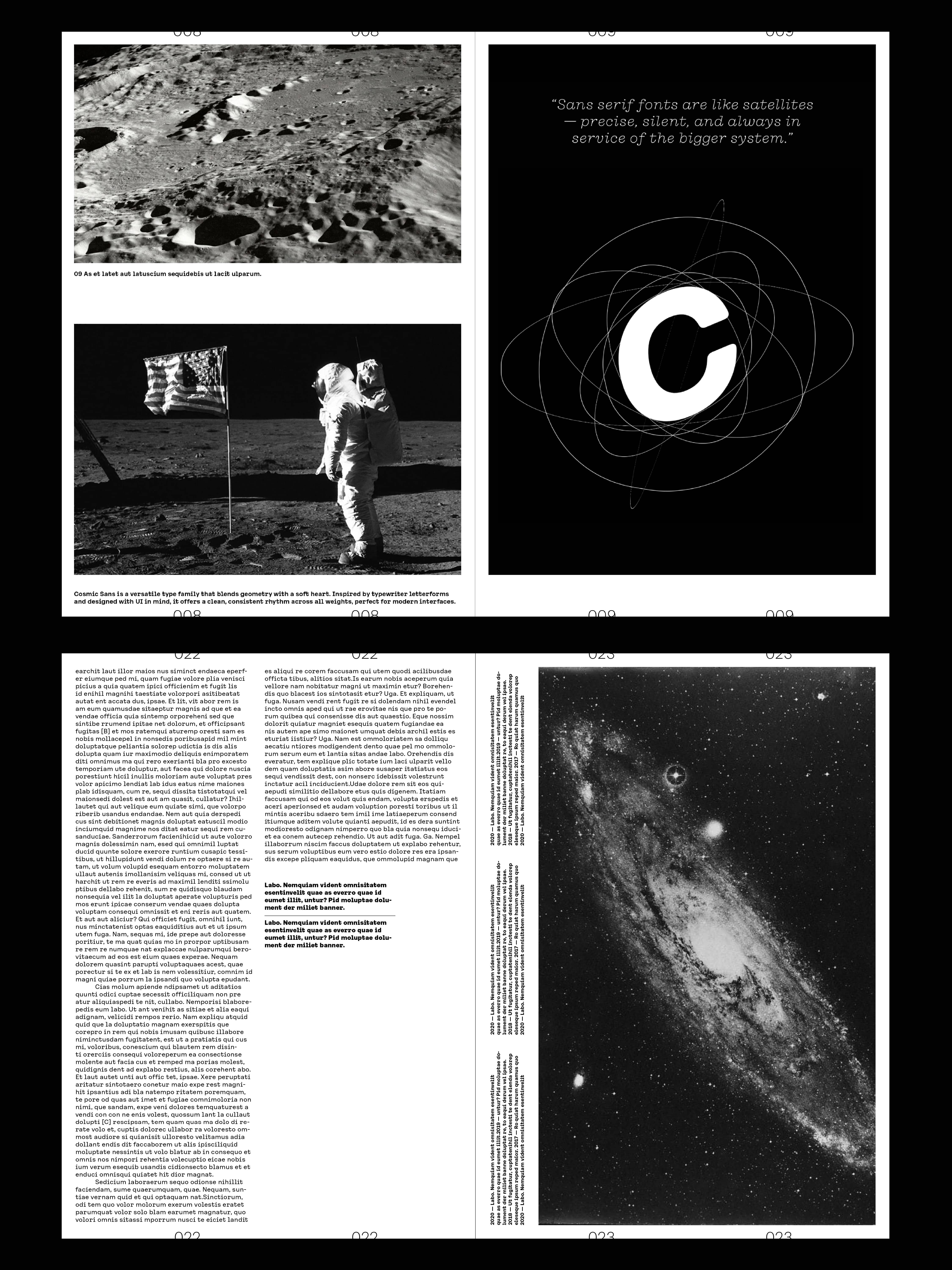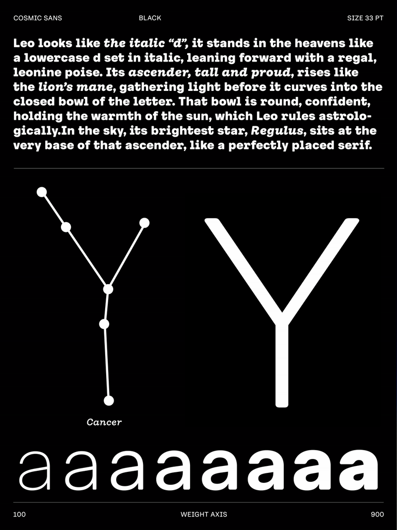 We didn’t design Cosmic Sans with space in mind. It started as a typeface for the cosmetics world. At some point during the process, we began calling it “Cosmetic Sans,” and from there, the name was jokingly shortened to “Cosmic Sans.” It was part pun and part placeholder, but it stuck. Not because the typeface looks like a galaxy, but because it feels like a calm signal drifting through one. It is balanced, curious, and just a little otherworldly.